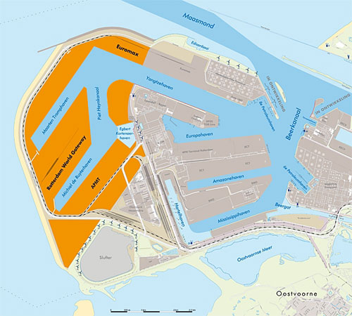 Auf dem Foto oben siehst du den Ausbau zur Maasvlakte 2 eingefärbt. Den alten Slufterstrand findest du im südlichen Bereich bei den Windmühlen. Der Slufterstrand ist ein jetziger Strandteil von Maasvlakte 1.
